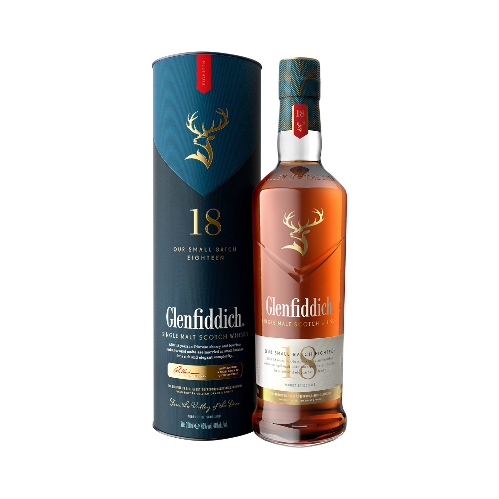 - El Glenfiddich 18 Años se madura durante 18 años en una combinación de barricas de roble europeo y barricas de bourbon americano, lo que le proporciona una complejidad de sabores y una suavidad excepcional.