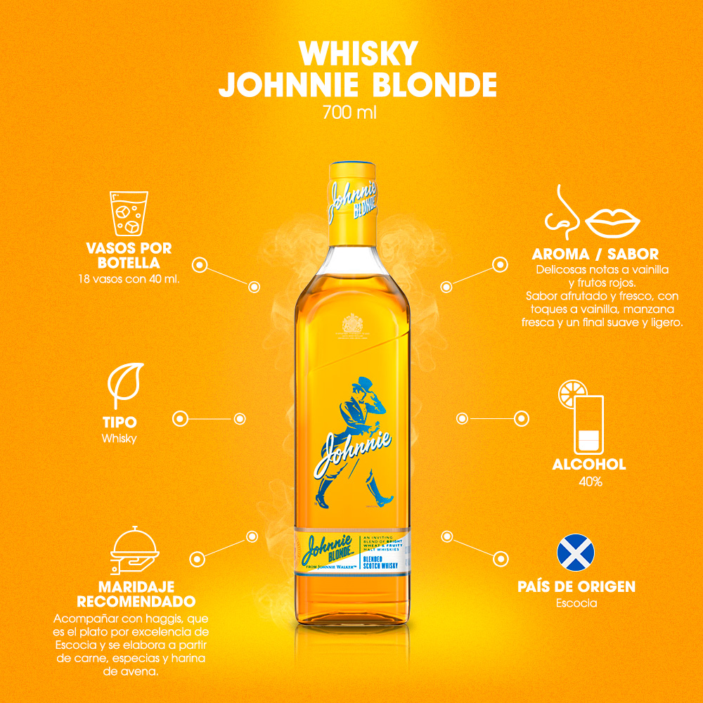 Johnnie Blonde, para los curiosos amantes del whisky escocés y los no bebedores de whisky. Hecho especialmente para mezclarse con un sabor más dulce, pero refrescante por sus toques cítricos.